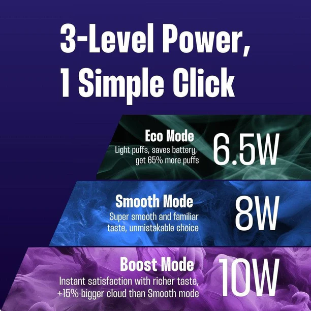 If you’re looking for a versatile vape, you’ve come to the right place. With adjustable power offering three different modes, the possibilities are endless. Choose Eco mode to conserve battery with lighter puffs, enjoy Smooth mode for a familiar, smooth taste, or elevate your experience with Boost mode for a more intense flavor and up to 15% more vapor than Smooth mode. These various modes allow you to customize your vaping experience, effortlessly adapting to each user and their circumstances, integrating easily into your routine.