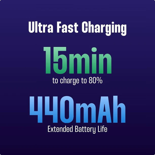 It charges up to 80% in just 15 minutes, with a powerful 440mAh battery for long-lasting performance.